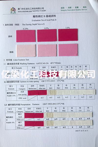 廈門市億染化工科技有限公司是一家集研發、生產、銷售一體的綜合型企業。公司主要經營:酸性染料、金屬絡合染料、高牢度分散染料及印染助劑。公司信守“以誠信贏合作、以質量贏市場、以創新贏發展、以服務贏生存”的企業精神服務于廣大客戶,多年以來建立了良好的市場口碑,市場遍布福建、廣東、浙江、江蘇、山東及東南亞國家,與多家知名企業建立了長期合作伙伴關系!
